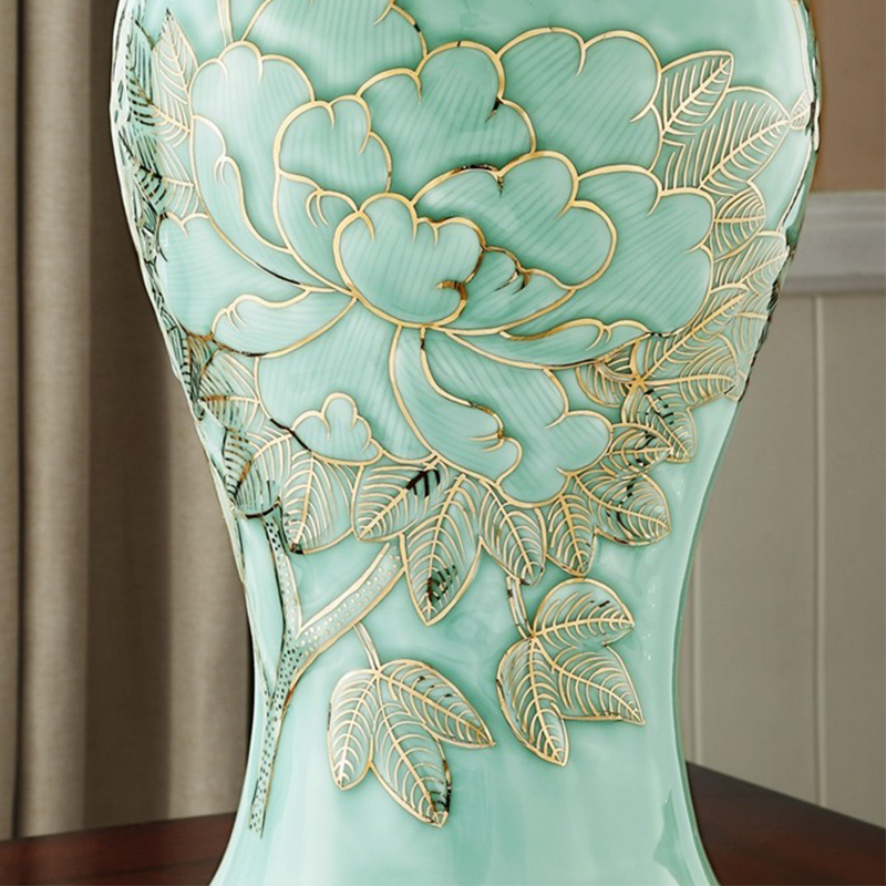 Chinese Celadon is a special porcelain technique handed down from ancient time, which is characterized by a refreshing teal color as a result of precise temperature control in the kiln. This gilded peony pattern is designed by one of the Jingdezhen porcelain masters, a piece to be collected and handed down over generations.