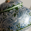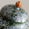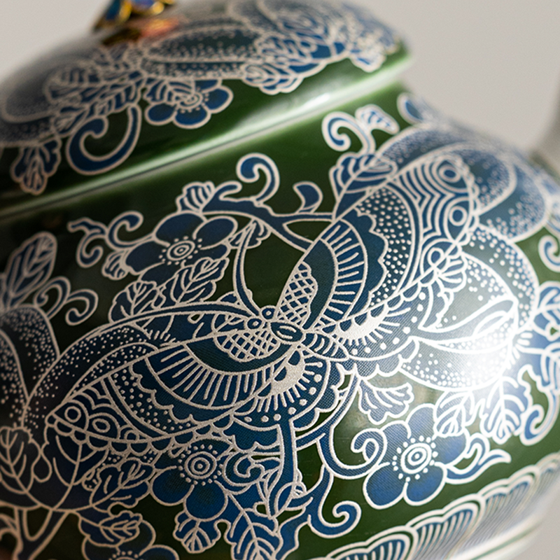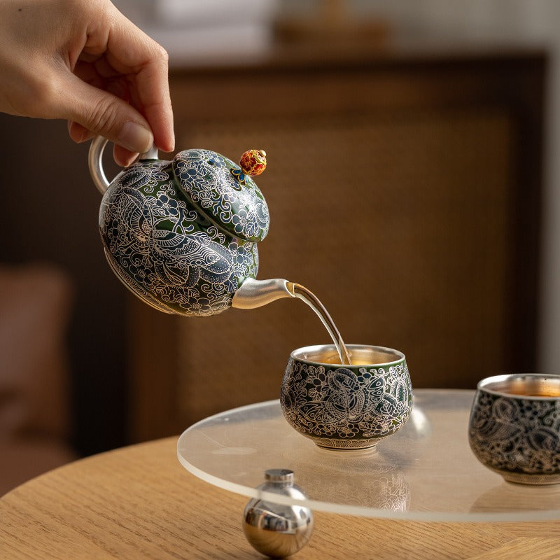 This tea set draws on traditional Chinese motifs and particularly features a silver gilded surface texture, which speaks of class and has a slight purification effect to the liquid content inside the pot and cup.