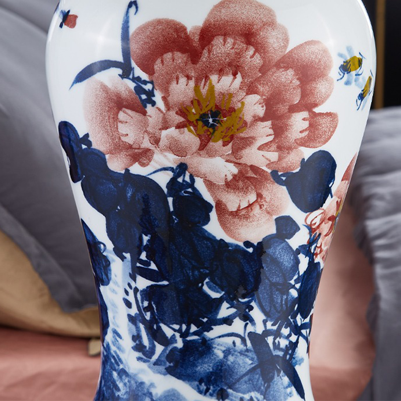 A masterly portrayed peony flower accentuated by cherry blossoms, over which honey bees busily are working. Hand painted by one of the China's porcelain masters, it's a piece to be collected and handed down.