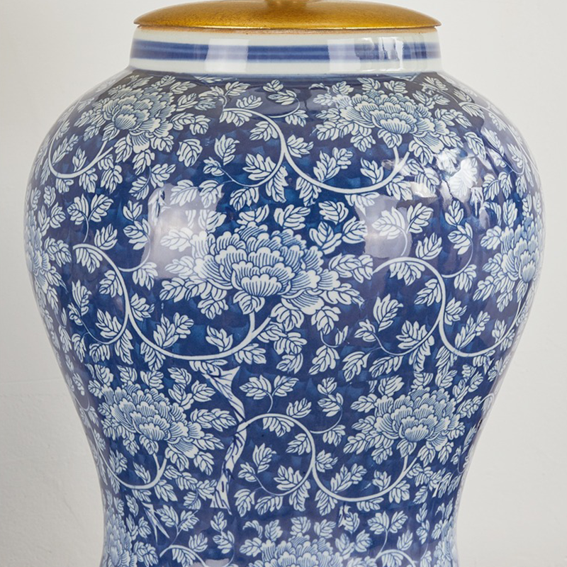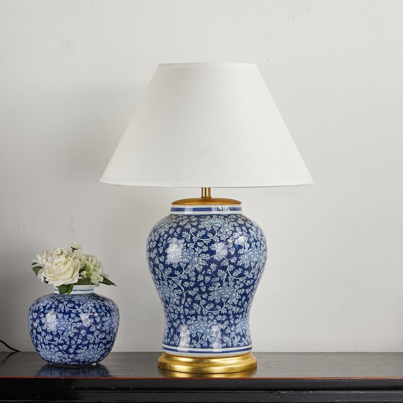 Classic blue and white porcelain lamp with floral and vine pattern. Shades available in two styles. Handmade in China.