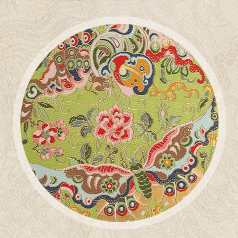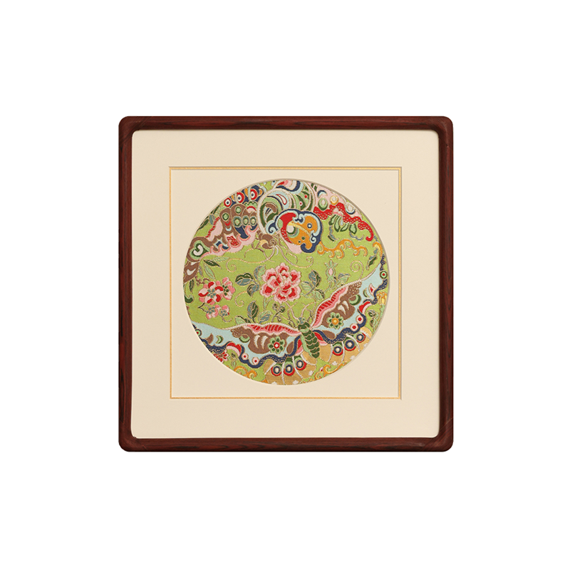 This artwork features a round pattern shaped by two butterflies facing towards each other, surrounding flowers and lush green grasses in the middle. Butterfly patterns were constantly used in imperial concubines' dress designs in ancient times, giving a feminine touch.